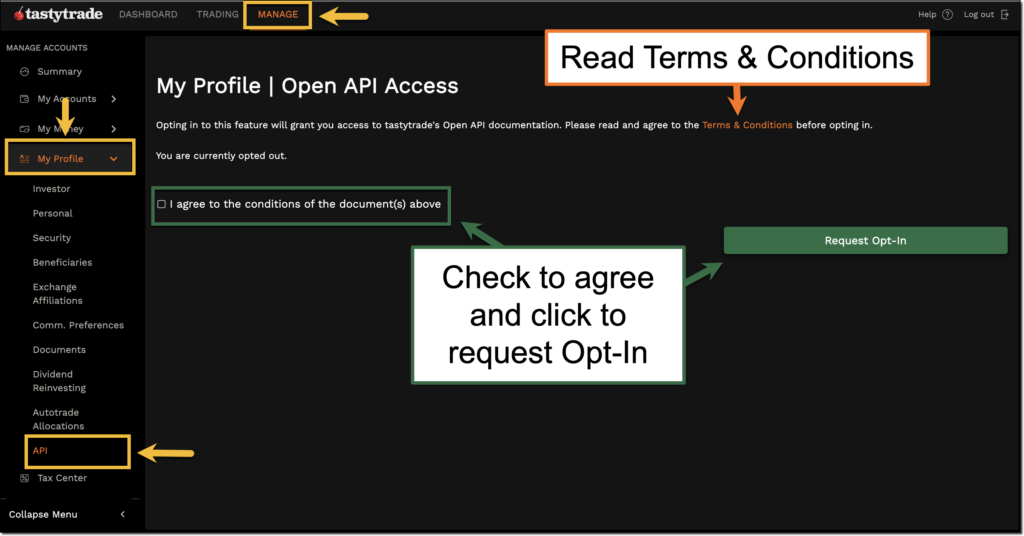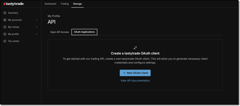 Zur Autorisierung des OptraBots über die API bei Tastytrade wird die Technologie OAuth anstatt eines klassischen Benutzernamen und Passworts verwendet. Dazu musst Du auf der Tastytrade Account Management Seite https://my.tastytrade.com/ eine Oauth App anlegen. Melde Dich dafür zunächst an dieser Seite an und Navigiere über den Manage Tab zur Seite API unterhalb von My profile.