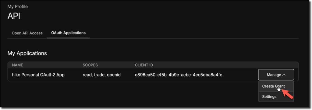 Als nächstes muss für die OAuth App ein Grant über Manage -> Create Grant erzeugt werden.