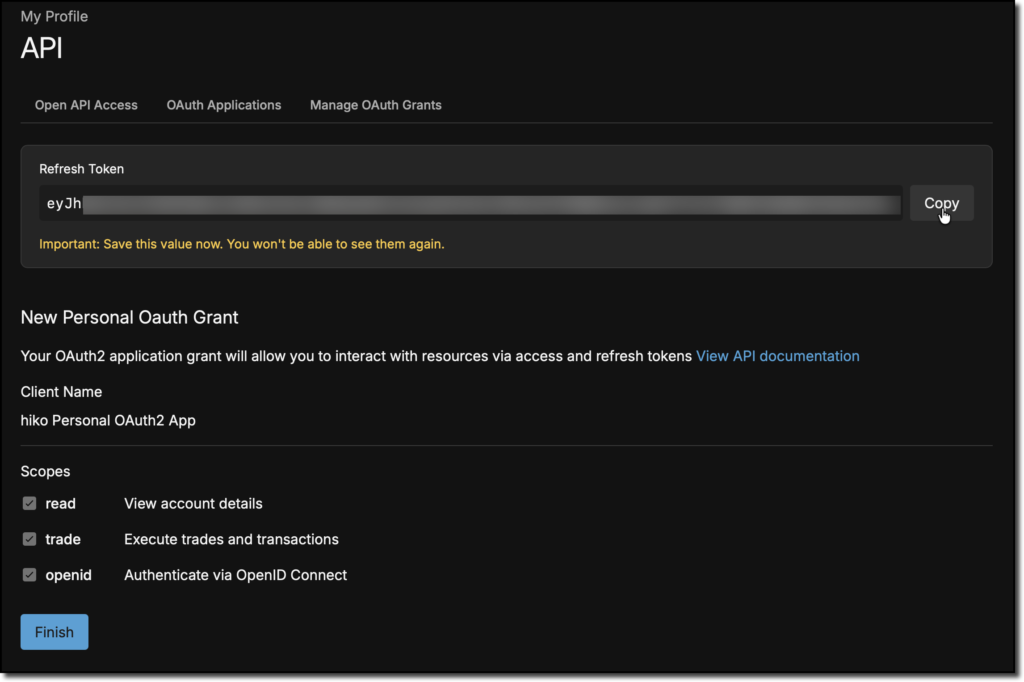 Anschließend muss die Erzeugung des Grants noch durch die Eingabe des 2FA Codes bestätigt werden. Danach wird der Refresh Token einmalig angezeigt und muss ebenfalls kopiert und sichergestellt werden, bevor Du auf Finish klickst.