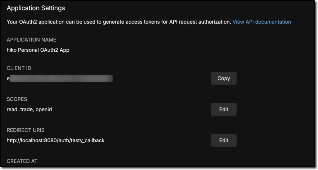 Gib als Callback URL http://localhost:8080/auth/tasty_callback und als Scope read, trade und openid ein. Bei der Generierung der App wird eine Client ID und ein Client Secret erzeugt. Das Client Secret wird nur einmal angezeigt und muss für die spätere Verwendung in der Konfiguration vom OptraBot gespeichert werden.